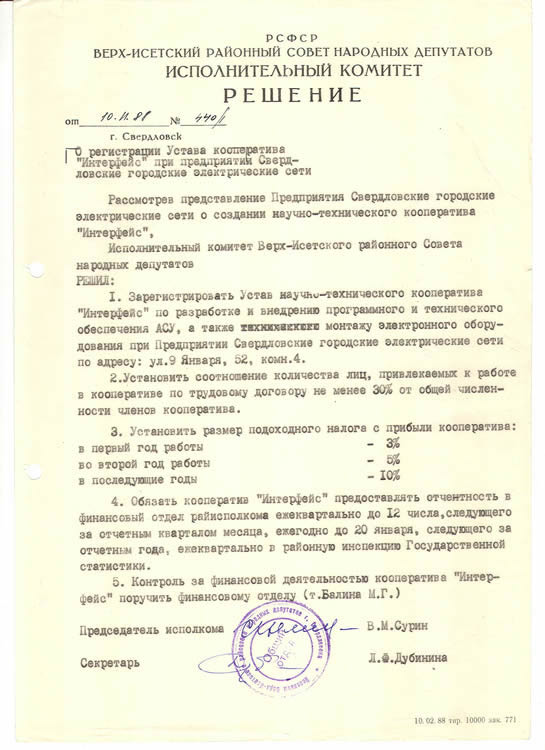 Компания «Интерфейс» была основана в 1988 году на базе предприятия «Свердловские городские электрические сети» как научно-технический кооператив. В то время исходной задачей коллектива стало создание и запуск автоматизированного рабочего места (АРМ) диспетчера.
