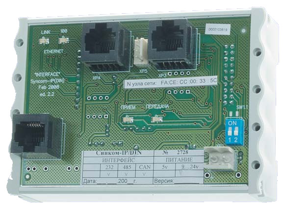 Основу контроллера «Синком-IP» составляет модуль, содержащий процессор архитектуры MCS-51 и набор микросхем, которые обеспечивают связь в протоколе UDP по локальной сети Ethernet. Контроллер выполнен в виде двухплатного модуля, предназначенного для установки на DIN-рейку.