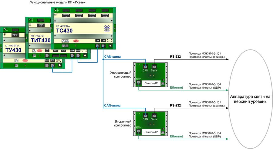 Для организации нескольких независимых каналов связи с верхним уровнем допускается установка нескольких управляющих контроллеров в составе КП, как показано на рисунке ниже.