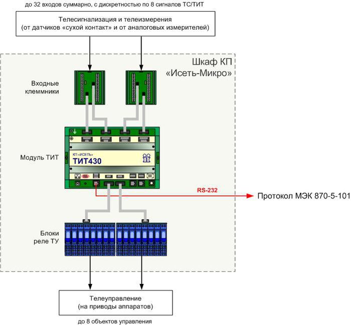 Таким образом, модуль «ТИТ430» может принимать на себя роль управляющего контроллера в составе КП «Исеть-Микро» на 32 входа ТС/ТИТ и 8 объектов ТУ, как показано на рисунке ниже.