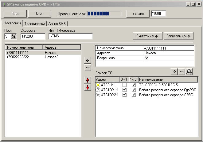 Программа предназначена для слежения за состоянием телесигналов на сервере и передачи сообщений об изменениях посредством SMS — при переходе сигнала в новое состояние на телефон адресата будет отправлено сообщение SMS, состоящее из наименования сигнала и нового состояния Допускается указание нескольких телефонов адресатов, каждый со своим списком ТС для наблюдения.