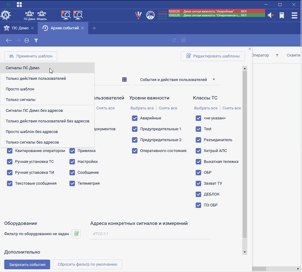 - Расширен функционал шаблонов фильтра архива событий: разделены режимы выбора и редактирования шаблонов, а также добавлена возможность применить шаблон без учета адресов сигналов и измерений;
