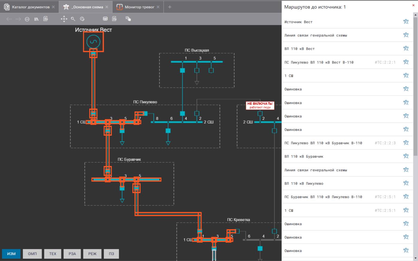 Кроме подсветки на схеме выводится подробный список с элементами, для каждого элемента доступна кнопка быстрого перехода.