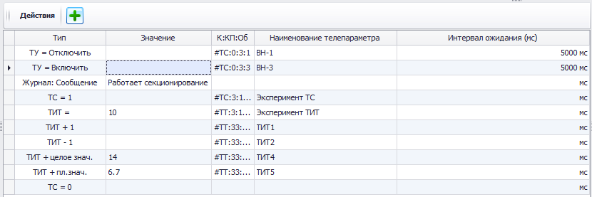 В таблице "Действия" указываются какие управляющие воздействия необходимо оказать на телепараметры при соблюдении всех заданных условий. Действия указываются последовательно.