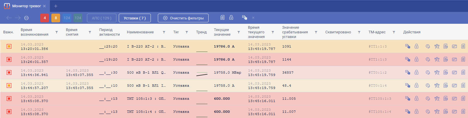 Работа со списком ТИТ вышедших за уставки производится с помощью функционала монитора тревог. Подробное описание доступно в разделе.