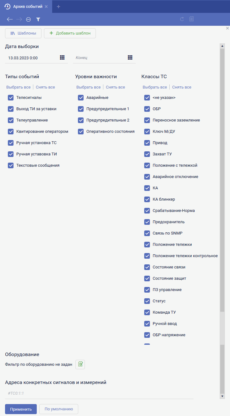 ЗСтраница позволяет просматривать архивные сообщения зафиксированные сервером, к которым относится информация о телесигналах, телеизмерения вышедших за уставки, команды телеуправления, сервисные сообщения, АПС. Запрос формируется с вводом временного интервала (дата выборки) в окне настройки фильтра.