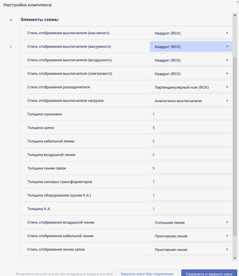 Настройки данного раздела позволяют выбрать возможные варианты отображения элементов оперативных схем, цвет отображения при включенном и отключенном состоянии, задать толщину элементов редактора Модус в пикселях.