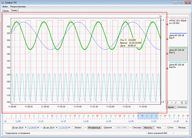 При выводе графиков можно использовать архивы мгновенных значений и агрегированные значения телепараметров (кнопки управления: «Мгновенные», «Средние» и «Мин/Макс»). В режиме «Мгновенные» отображаются все имеющиеся в БД значения телепараметра на заданном интервале времени. В режиме «Средние» на график выводятся агрегированные значения телепараметра (среднее, максимум и минимум за период). Период агрегации подбирается автоматически в зависимости от масштаба.