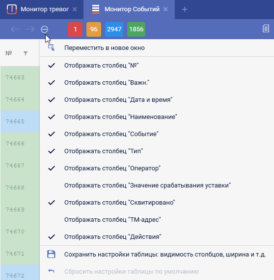 Открыть меню страницы в котором можно выбрать отображаемые столбцы монитора, сохранить настройки таблицы, переместить монитор в новое окно;