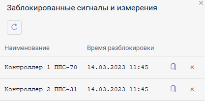 Открыть список заблокированных событий; Поступление событий может быть заблокировано на различные временные промежутки, с помощью нажатия кнопки можно увидеть весь список заблокированных параметров с временем их разблокировки