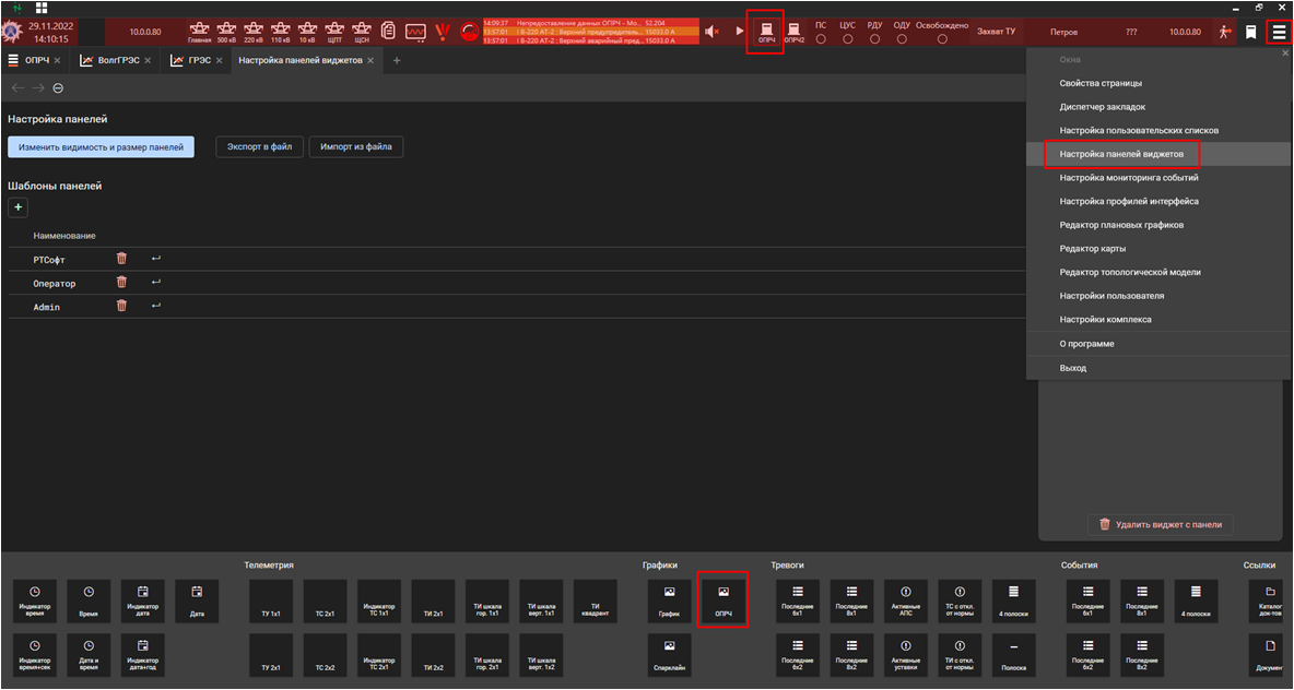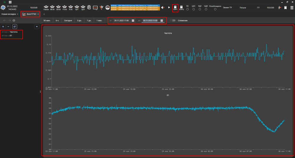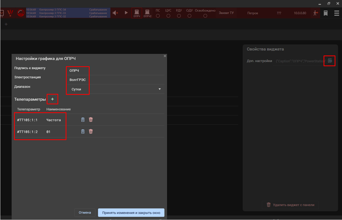При нажатии на виджет будет открыто окно с графиками по выбранным телепараметрам на заданном интервале времени: