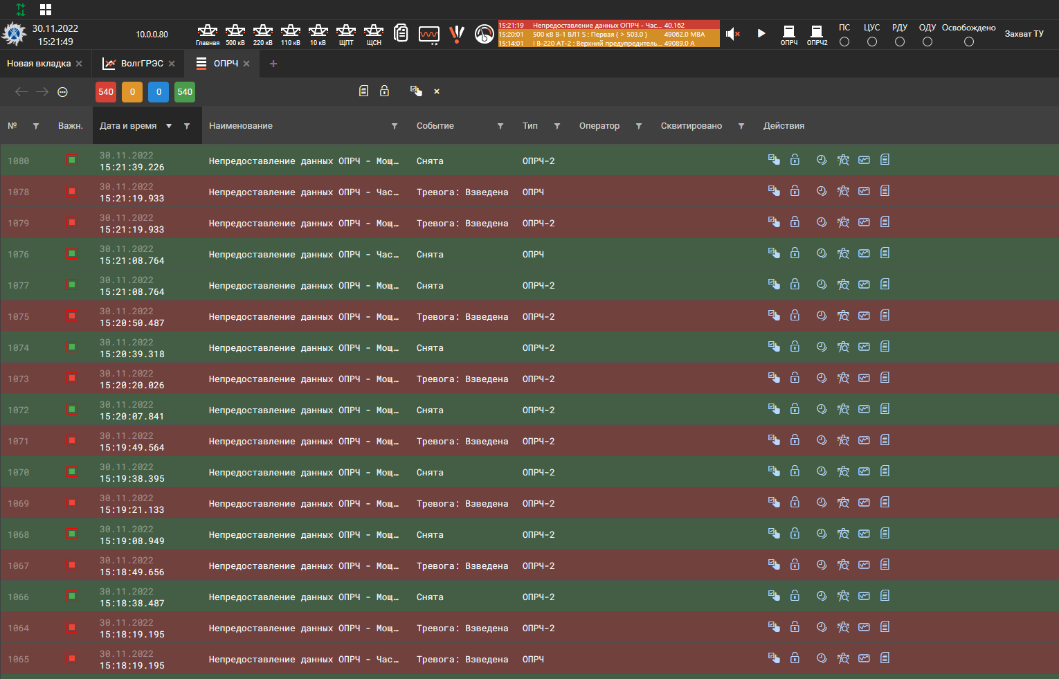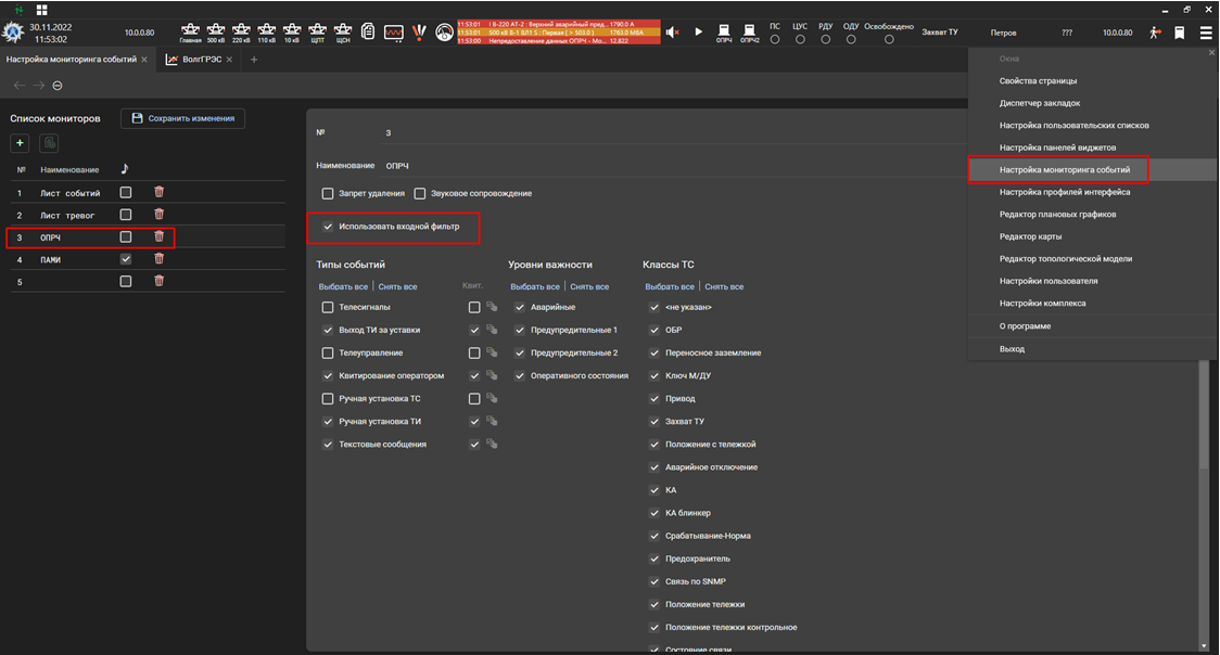 Для удобства отслеживания взведения данной уставки в ПО Клиент10 можно настроить монитор событий по заданным параметрам: