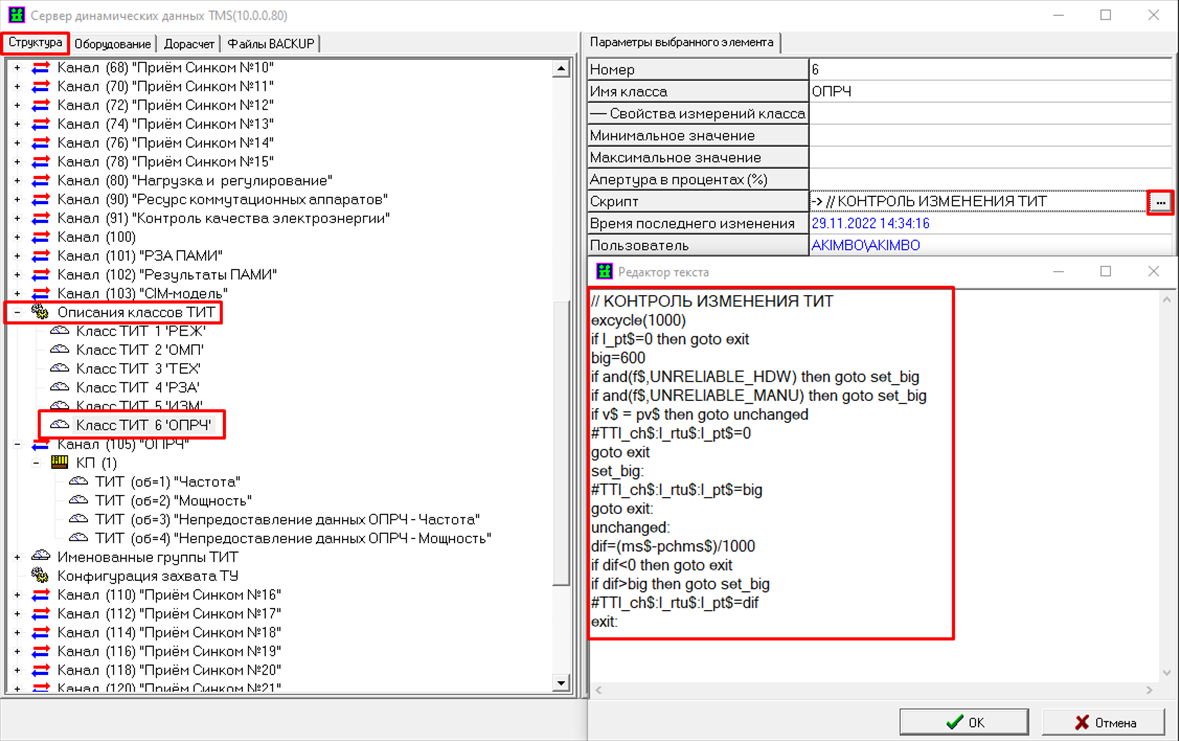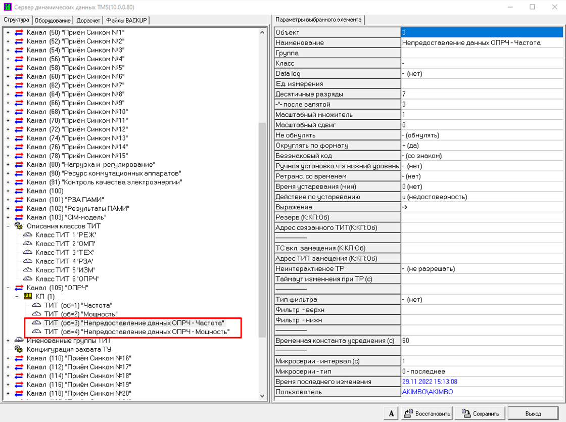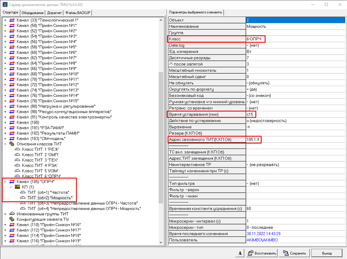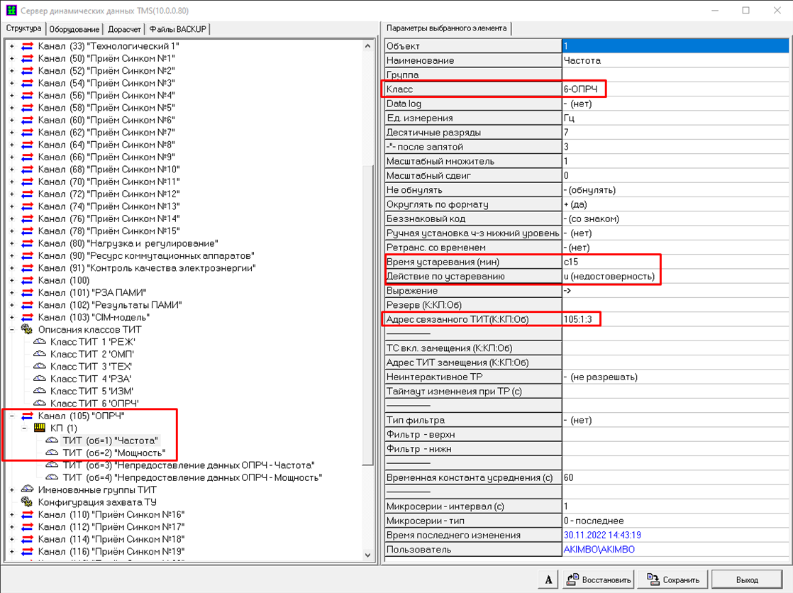 Данный класс ТИТ (ОПРЧ) применяется к ТИТам в структуре сервера в которые будут приходить измерения, участвующие в мониторинге (Частота или Мощность). Так же данным ТИТам необходимо указать параметр «Время устаревания», при превышении которого будет присвоена недостоверность и адрес связанного ТИТ: