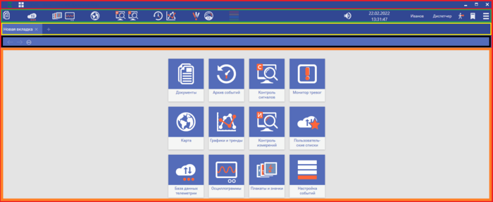 ПО Клиент10 реализовано с использованием системы вкладок, поэтому интерфейс главного окна ПО делится на пять основных рабочих областей: