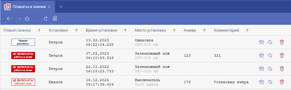 в открывшемся списке доступна информация о типе установленного плаката/значка, о том кто установил плакат и в какое время, место установки, номер и комментарий оставленный при установке.