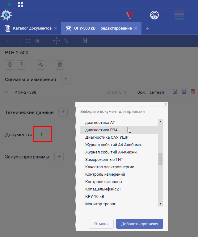 Для привязки необходимо ЛКМ нажать на элемент схемы к которому планируется привязать телепараметр. В появившемся окне, в разделе "Документы" нажать кнопку