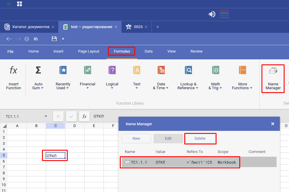 Для удаления привязки необходимо перейти в раздел меню редактора “Formulas” – “Name Manager”, выбрать необходимую ячейку и нажать “удалить/delete”: