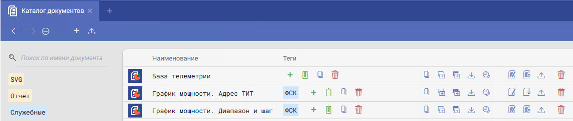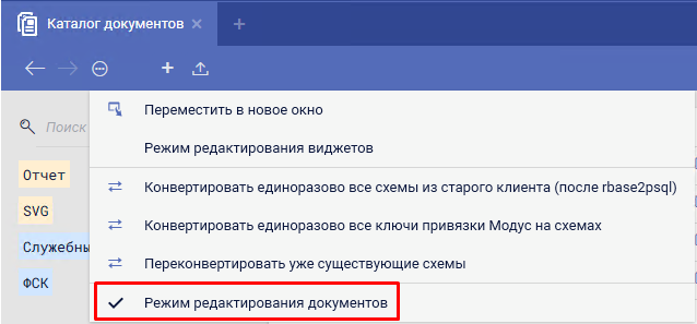 После нажатия пункта меню "Режим редактирования документов" в поле каталога документов становятся доступными дополнительные элементы действий.