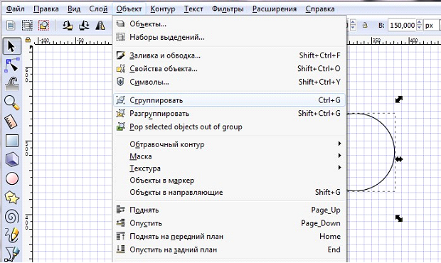 Чтобы сгруппировать несколько объектов, нужно выделить их все и нажать Ctrl+G (или выбрать в меню Объект пункт Сгруппировать). При перемещении и трансформации группа ведет себя как один объект. Чтобы разгруппировать одну или несколько групп, нужно выбирать их и нажимать Shift+Ctrl+G(или выбрать в меню Объект пункт Разгруппировать).