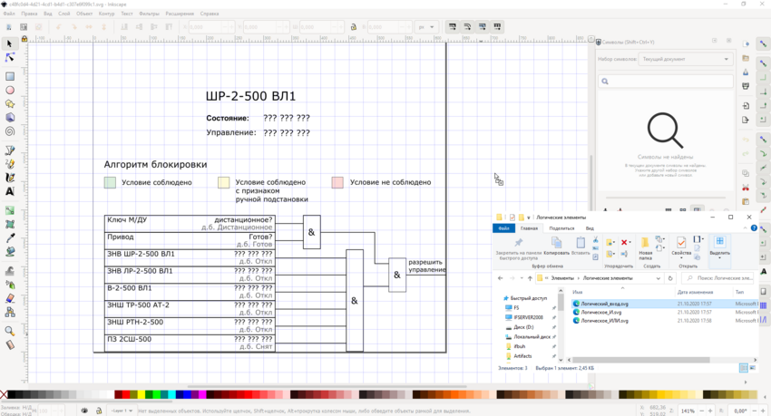 Из библиотеки элементов (Элементы – Логический элементы) берем элемент Логический_вход и вставляем его в схему, настраиваем расположение. Библиотека элементов доступна по пути установки ПО Клиент10 в каталоге Tools/SVG/Элементы. Пример пути для стандартной установки C:\Program Files (x86)\OikClient10\Tools\Svg\Элементы. Перенести необходимый элемент в создаваемый файл можно переносом с помощью функции drag and drop.