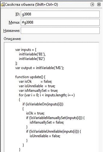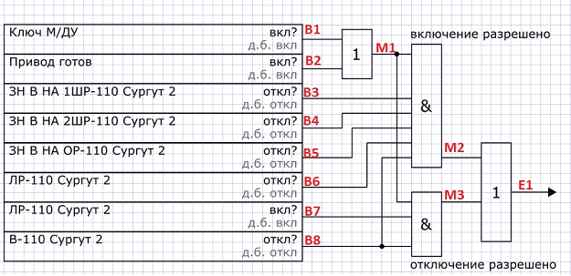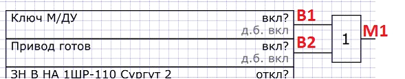 задаём входные переменные, которые мы ранее инициализировали в элементах с логическим входом (B1,B2), а также переменную на выходе (М1)