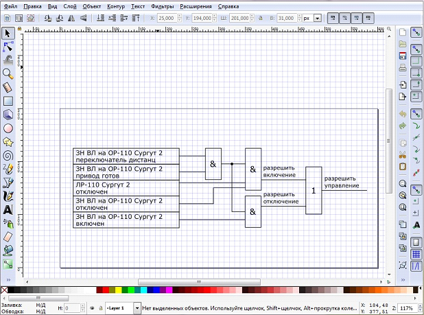 По аналогии вставляем из библиотеки все остальные логические элементы (не забывая редактировать их свойства). Настраиваем их размеры, расположение. Соединяем между собой линиями (с помощью инструмента Рисовать кривые Безье и прямые линии)