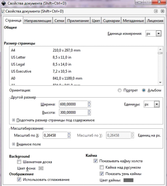 Изменить свойства документа можно из меню Файл - Свойства документа. Выбираем единицы измерения – пиксели, указываем размер листа . Также при необходимости меняем цвет фона, каймы, подключаем/отключаем прилипание, настраиваем сетку с нужным шагом.