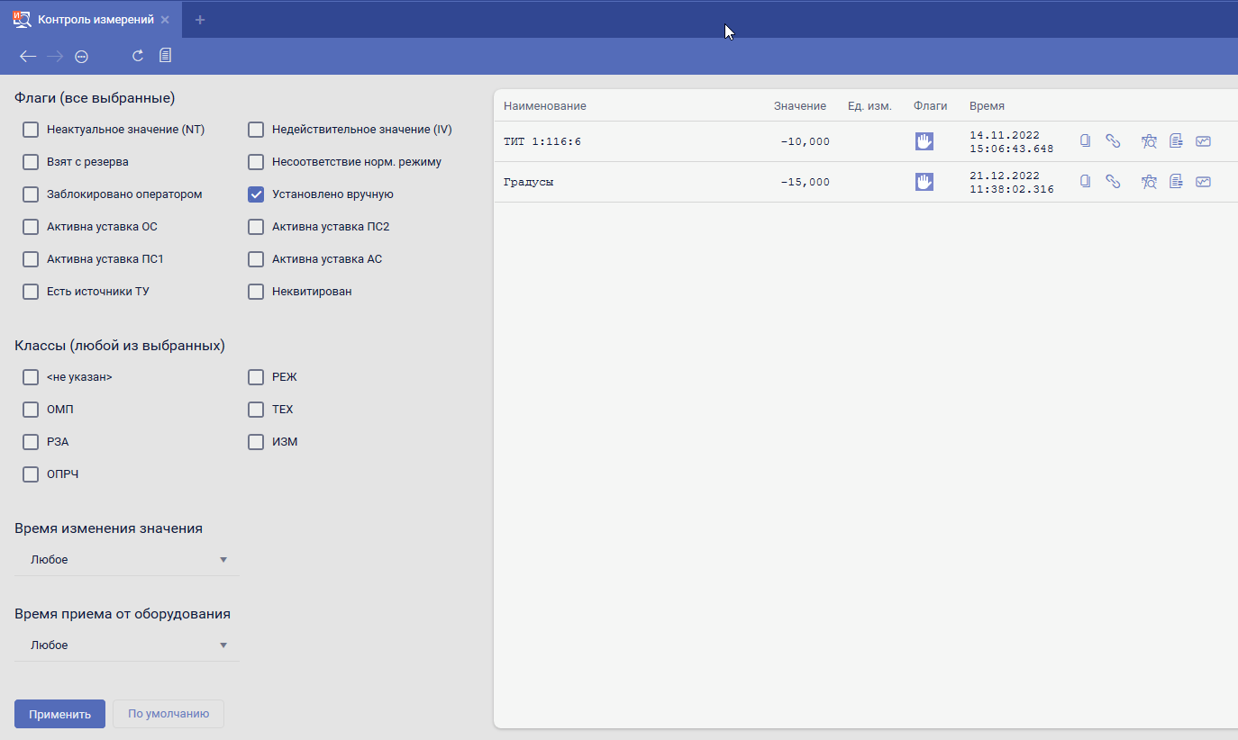 Просмотр списка телеизмерений установленных вручную осуществляется с помощью инструмента "Контроль измерений" Данный инструмент позволяет осуществить запрос текущего состояния телесигналов с любым интересующим нас флагом. В появившемся после запроса окне мы можем увидеть диспетчерское наименование параметра, информацию о текущем значении, единицах измерения, взведенных флагах, времени изменения.