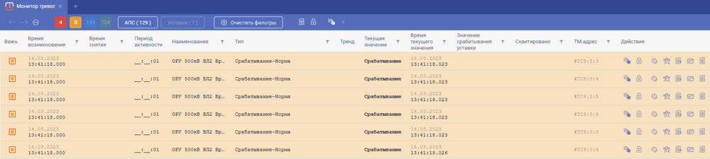 Для просмотра списка аварийно - предупредительных сигналов необходимо вызывать виджет . После нажатия на виджет открывается монитор-тревог с установленным фильтром отображения аварийно - предупредительной сигнализации В списке отображаются все аварийно - предупредительные сигналы, зафиксированные комплексом, на данный момент времени. При просмотре список обновляется автоматически с заданным периодом обновления. Пример списка активных АПС приведен на рисунке.