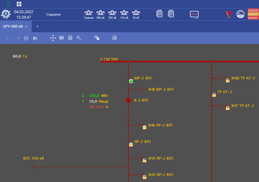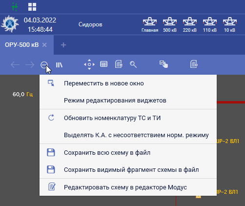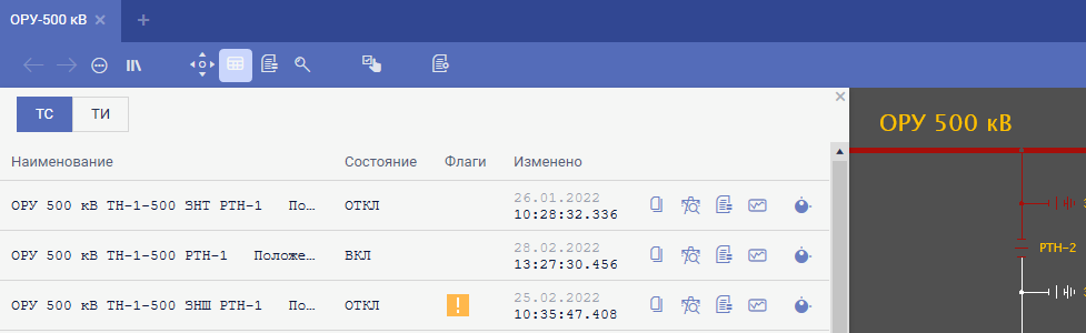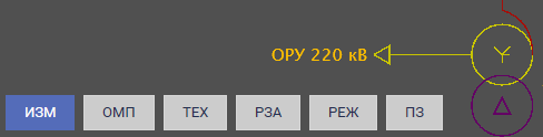 Кнопки доступные в нижнем левом углу каждой оперативной схемы используются для отображения дополнительных свойств элементов схемы. Например, такие как: дополнительные измерения, события, технические параметры и паспортные данные оборудования, информация о релейной защите и автоматике.