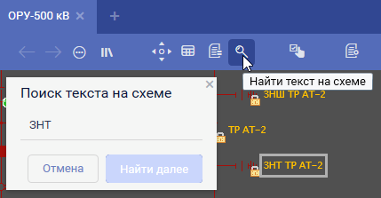 Возможность поиска текста на схеме, найденные элементы подсвечиваются рамкой серого цвета.