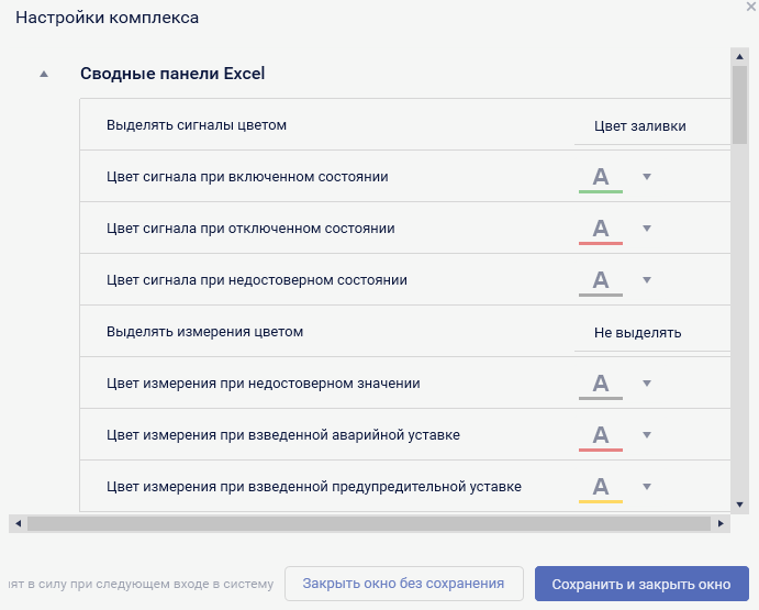 Цвет измерения при взведенной аварийной уставке. По умолчанию используется красный цвет, при нажатии на значок становится доступна палитра для выбор цвета;
