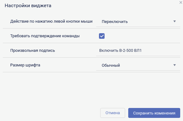 - подать команду ТУ. При нажатии на виджет будет выдана команда переключения состояния объекта (включить/отключить) с обязательным окном подтверждения;