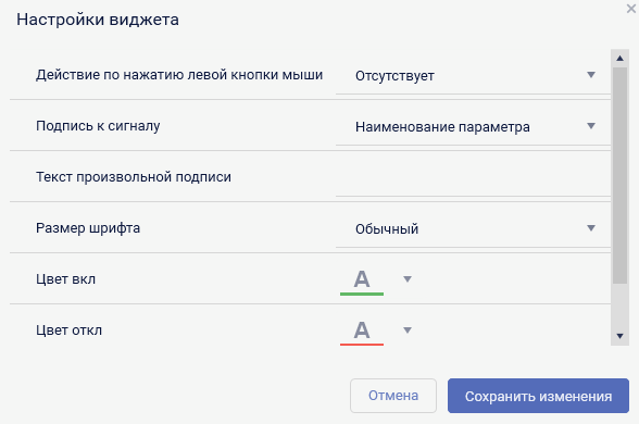 Цвет откл. Настройка доступна только для виджетов с индикатором в виде лампы, дает возможность выбора цвета отключенного состояния привязанного ТС;