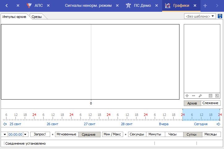 Режим «Архив» предназначен для вывода данных на график за любой необходимый период времени. В данном режиме доступны все элементы панели управления.