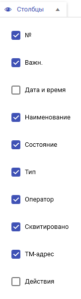 По умолчанию журнал событий отображает информационные столбцы: №, Важность, Дата и время, Наименование, Состояние, ТИП, Оператор, Скивтировано, ТМ-адрес, Действия. К отображению столбцов возможно применить индивидуальные пользовательские настройки, такие как: