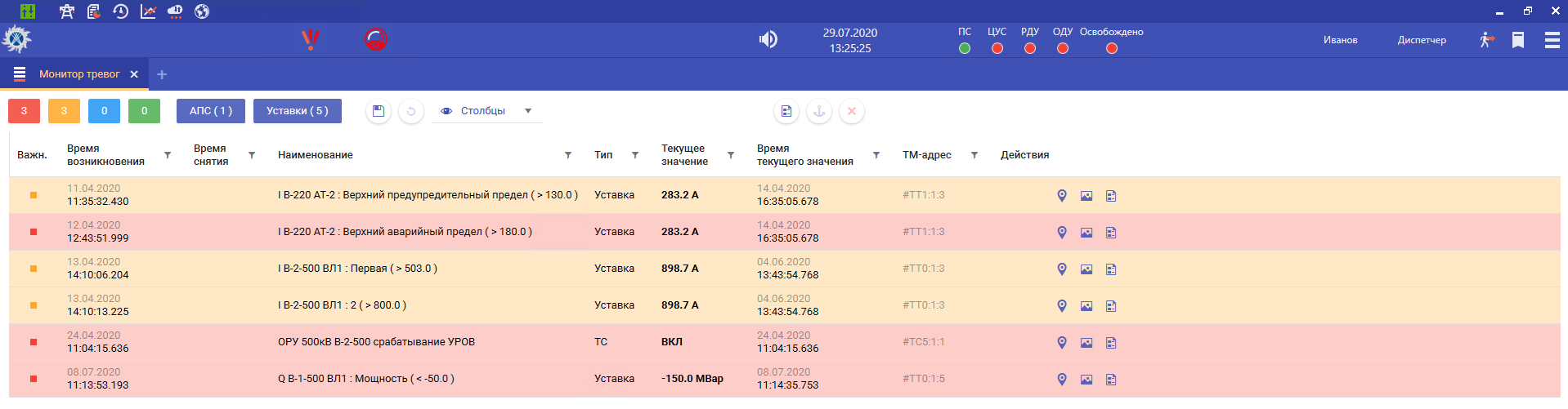 Набор кнопок позволяет оперативно получить информацию о количестве взведенных АПС и уставок. Так же нажатие ЛКМ на одну из кнопок важности позволяет произвести быструю фильтрацию записей монитора.