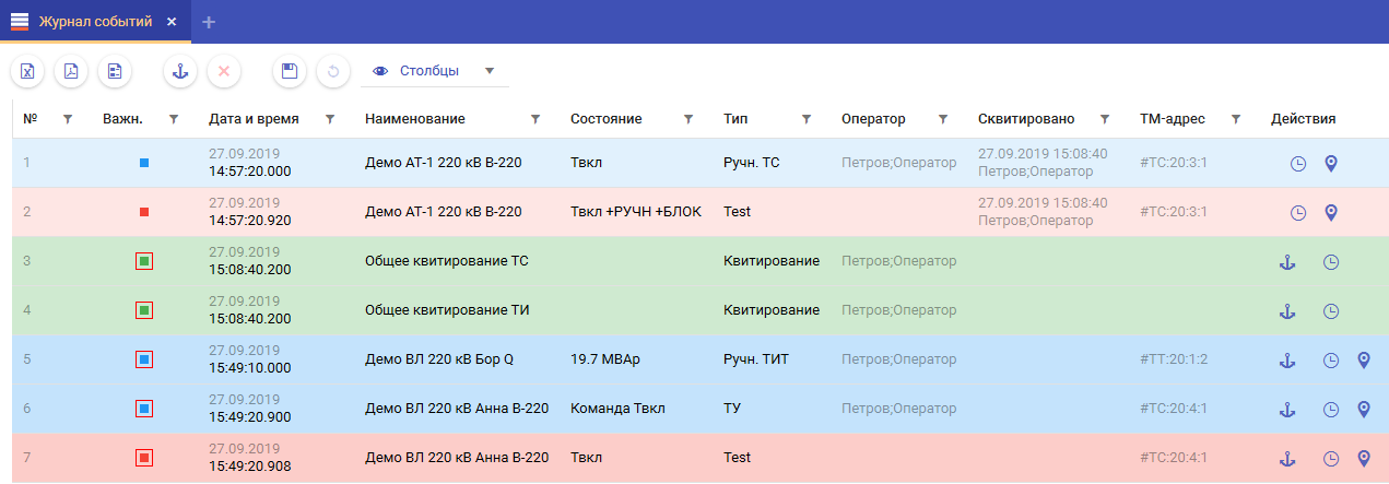 Эти же цвета используются для подсветки групп событий в журнале событий и журнале тревог.
