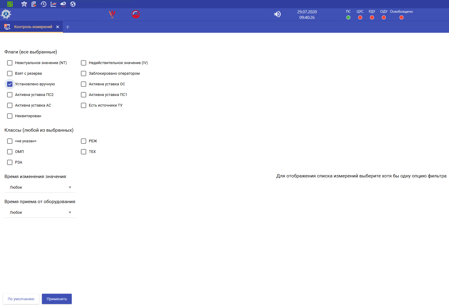 В списке отображаются все ТС, установленные на данный момент времени вручную. Для просмотра списка ТИ, установленных вручную необходимо воспользоваться инструментом контроля измерений.