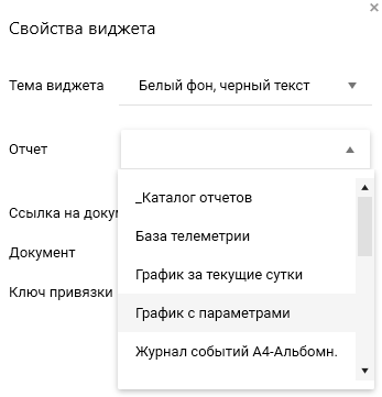 Возможность выбора отображения указанного отчета. Для этого в свойствах виджета необходимо выбрать отчёт из выпадающего списка.