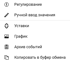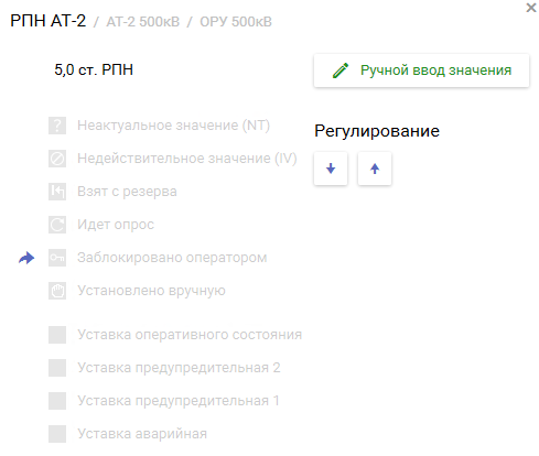 При просмотре оперативной схемы можно активировать окно дополнительных действий нажав ПКМ на элементе схемы. При нажатии ПКМ на элемент к которому осуществлена привязка телеизмерения, открывается контекстное меню управления: