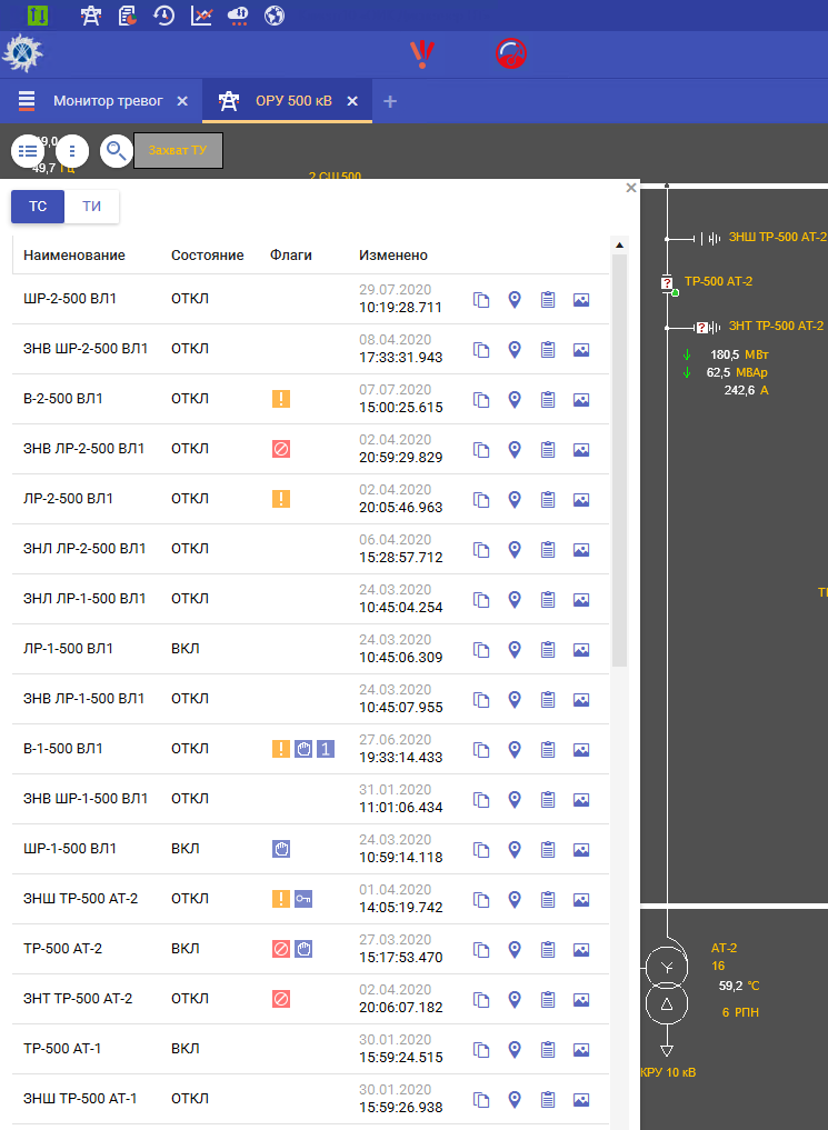 После в левой части схемы будет открыта таблица текущих значений. Переход от списка телесигналов к списку телеизмерений осуществляется при помощи переключения кнопки