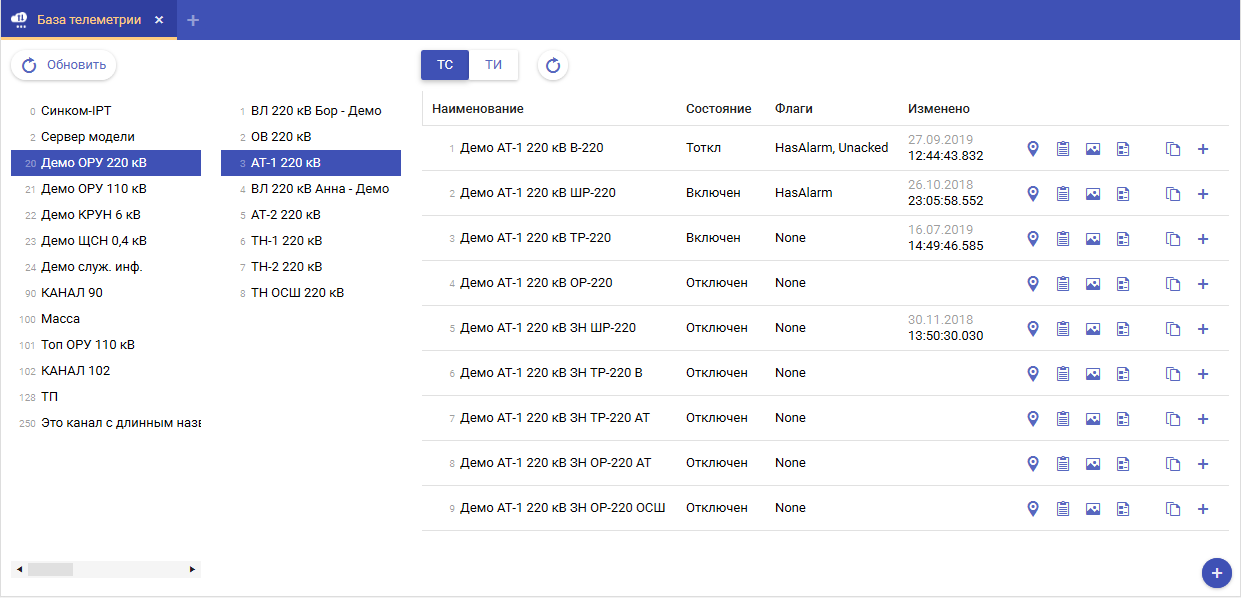 Страница базы телеметрии предоставляет доступ к структуре базы данных ПО сервера "ОИК Диспетчер НТ". Позволяет в виде таблице просматривать информацию о телепараметрах: состояние, взведенные флаги, время последнего изменения. Переход от списка телесигналов к списку телеизмерений осуществляется при помощи переключения кнопки . Обновление данных происходит по нажатию кнопки .