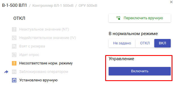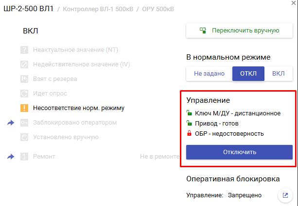 Сервер «ОИК Диспетчер НТ» сразу проверяет допустимость переключения в зависимости от достоверности текущего положения, ключа управления местное/дистанционное, вывода аппарата в ремонт, действия оперативной блокировки и др. В случае запрета на управление соответствующее уведомление будет отображено в этом же окне, а кнопка управления будет заблокирована. Пример блокировки телеуправления приведен на рисунке.