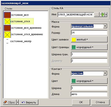 В редакторе Модус на оперативной схеме выделить заземляющий нож, ПКМ активировать контекстное меню, в котором выбрать строку ‘Стили КА’ и настроить их. На Рис. 7.35 приведен пример настройки переносного плаката заземления (с учетом требований ФСК ЕЭС).