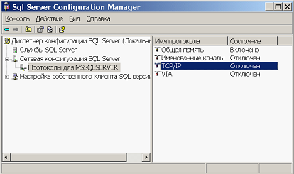 В дереве компонентов диспетчера (слева) выбрать раздел «Сетевая конфигурация SQL Server»→«Протоколы для MSSQLSERVER». Сделать двойной щелчок ЛКМ на строке «TCP/IP».