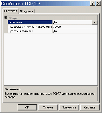 2) В окне «Свойства TCP/IP» на вкладке «Протокол» установить свойство «Включено» - «Да» (см. Рис. 4.21). На вкладке «IP-адреса», в разделе «IPAll» задать параметр «TCP - порт» - «1433» (см. Рис. 4.22). Нажать кнопку «ОК».