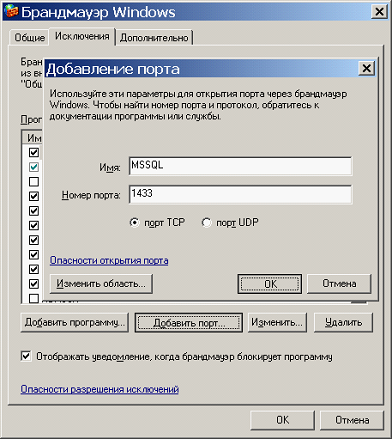 4) Если на компьютере установлен какой-либо межсетевой экран (FireWall), то в настройках данного ПО необходимо разрешить входящие соединения по протоколу TCP/IP на порт 1433 (позволит подключение к SQL - серверу с других компьютеров), а также по протоколу UDP на порт 1434 (позволит другим компьютерам обнаруживать данный экземпляр SQL-сервера).