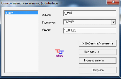 Может возникнуть необходимость запуска ПО клиент «ОИК Диспетчер НТ» пользователем, зарегистрированным вне домена ПО сервера «ОИК Диспетчер НТ». В этом случае при регистрации (см. рис. 5.1) вместо имени компьютера следует использовать «Алиас» - псевдоним компьютера. Программа, которая используется для создания «Алиасов» - cfssetup.exe. Она запускается из каталога установки ПО клиент «ОИК Диспетчер НТ» (C:\Program Files (x86)\InterfaceSSH\WinDispNT). Интерфейс программы cfssetup.exe приведен на Рис. 5.4.