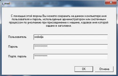 При создании, каждому «Алиасу» (s_mwi) ставится в соответствие имя Windows - пользователя и его пароль. Для перехода в окно ввода имени и пароля (см. Рис. 5.5) следует нажать ЛКМ на кнопке «Пользователь» в окне описания алиасов.